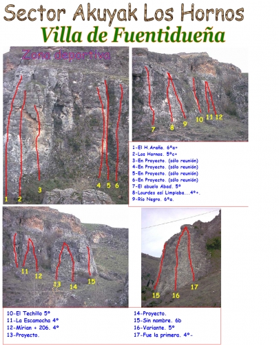 Pequeña escuela de escalada muy tranquila. Dispone de unas 30 vías en caliza muy variadas y divertidas, de grados medios, con los seguros en buen estado, que varian desde el IV grado, hasta el 7a. Tiene una altura media de 24 metros. La escuela tiene dos sectores: el sector Muralla y el sector Los Hornos, donde predominan los grados sencillos (IV,V). Escalar preferiblemente de la primavera al otoño, en verano se puede disfrutar de un baño en el río. El pueblo vale la pena visitarlo. También se pueden practicar otros deportes como la bici de montaña o el senderismo, e incluso el piragüismo en las cercanías (Hoces del Duratón).