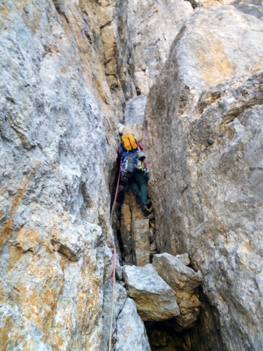 • (L5) Ansiado sol - A punto de llegar a la reunión del quinto largo, a la salida del primer gran diedro, empezamos a disfrutar de los rayos del sol, por fin!!