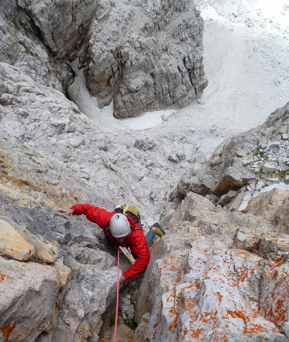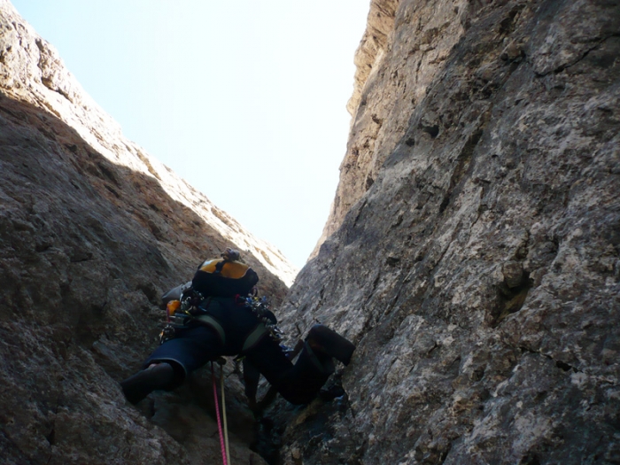 • (L5) Primer diedro - Javi luchando contra el frío en el primer gran diedro de la Fehrmann. En la reunión de este largo empezaron a alcanzarnos los rayos del sol.