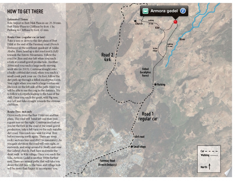 Todas las vías han sido equipadas entre Marzo y junio de 2013 por el escalador Nicodemus y sus amigos. Para consultar las posibles novedades o nuevas vías se puede consultar el grupo de Facebook "Rock Climbers, Ethiopia". Para ampliar información sobre esta zona u otros destinos en Etiopía se puede consultar directamente con el autor de las vías Nicodemus en la siguiente dirección de correo: nico.parco@gmail.com.