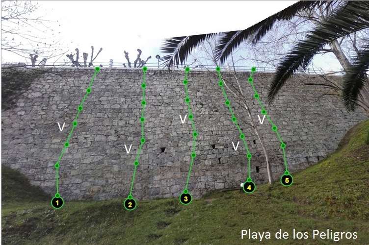 Son vías de aproximadamente 13 metros, todas son V. En la actualidad de las 7 vías originales sólo quedan 5, las de los extremos están impracticables: chapas antiguas y roñosas una y sin descuelgue la otra.