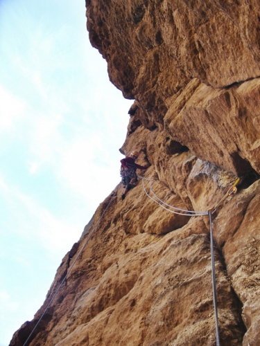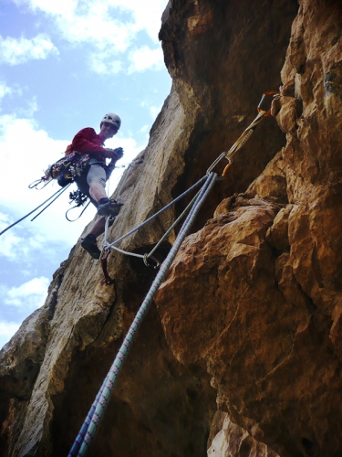 • Equipando - Ramón Cadalàs durante el equipamiento del primer largo del Mostruo está ciego. Foto tomada desde la reunión en el primer mirador.