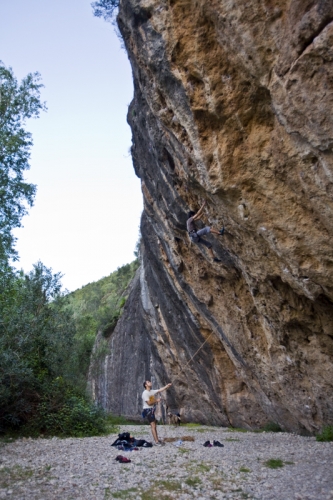 Se trata de un muro desplomado de caliza anaranjada donde encontramos una decena de vías equipadas con parabolts. El pie de vía en este sector está formado por cantos rodados.