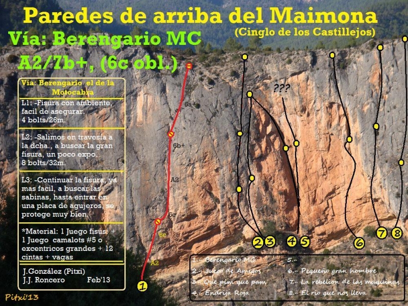 Continuar la fisura, ya más fácil, a buscar las sabinas, hasta entrar en una placa de agujeros. Se protege muy bien.