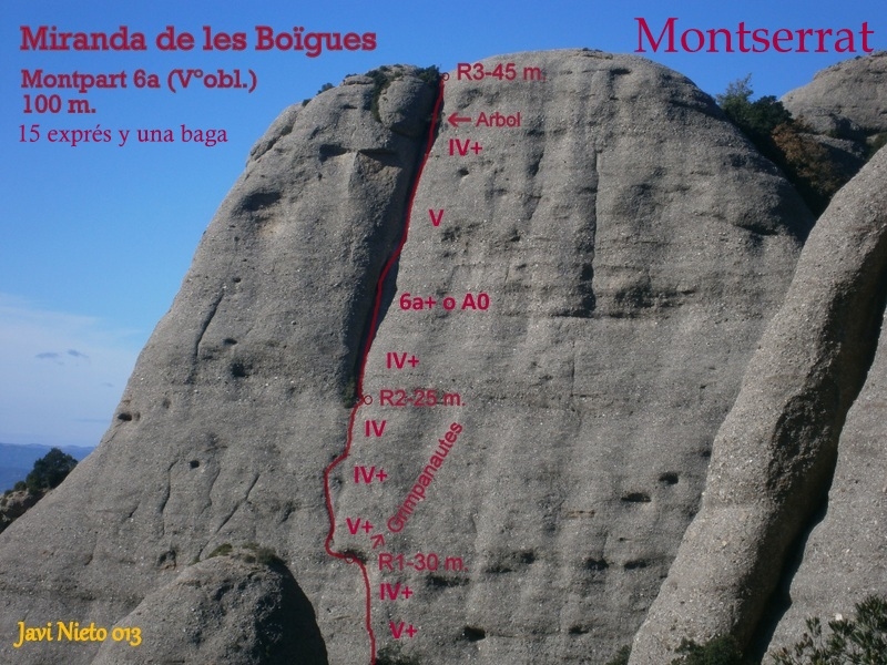 El comienzo se situa en lo alto del colladito, localizar la primera expansión a unos 4 metros del suelo. Tramo verticalcon secciones de Vº y V+, seguimos hasta una reunión desde donde iniciaremos un flanqueo a la izquierda en busca de una bauma.R-1