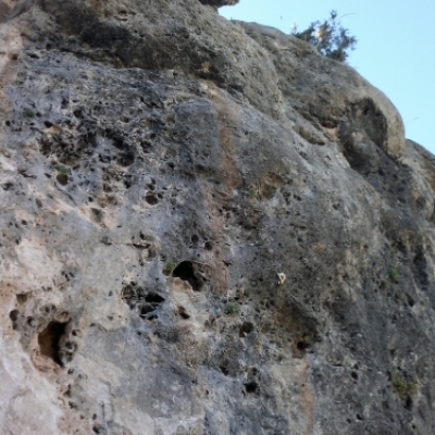 Vía a bloque. Fácil hasta la primera chapa. Desde un gran agujero que se coge normal con derecha e invertido con izquierda se chapa la 2º chapa, del agujero se va a un romo con derecha, y con izquierda a un agujero doble, de ahí a la reunión es mas sencilla.