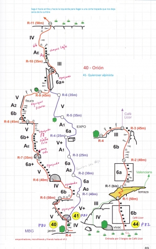 Buena vía con largos muy aéreos. Prácticamente equipada, salvo el largo 9. Algún tramo de roca muy mala pero muy bien protegido con parabolts. Desde la reunión 7 abandono muy difícil.