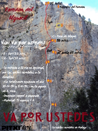 Recorre un itinerario espectacular, que a pesar de su paso de bloque en la entrada del largo dos, no deja de ser un 6b+, no os dejeis influir por el número 7a+, yo he aprendido a llamarle A0. (Pitxi)