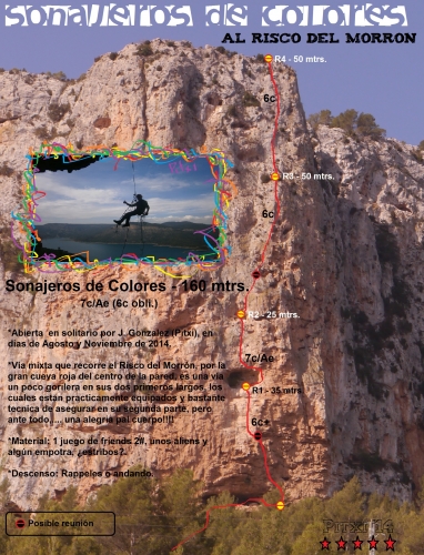 Vía mixta que recorre el Risco del Morrón por la gran cueva roja del centro de la pared; es una vía un poco gorilera en sus dos primeros largos, los cuales están prácticamente equipados, y bastante técnica de asegurar en su segunda parte, pero ante todo... una alegría pal cuerpo !!!