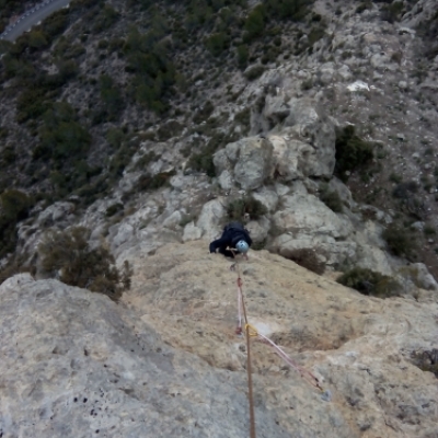 Sale de la reunión por una placa gris tumbada con fisura por la izquierda, cruza una amplia repisa y se encarama por un muro naranja lleno de agujeros hasta una cómoda repisa unos metros por debajo de la cumbre.