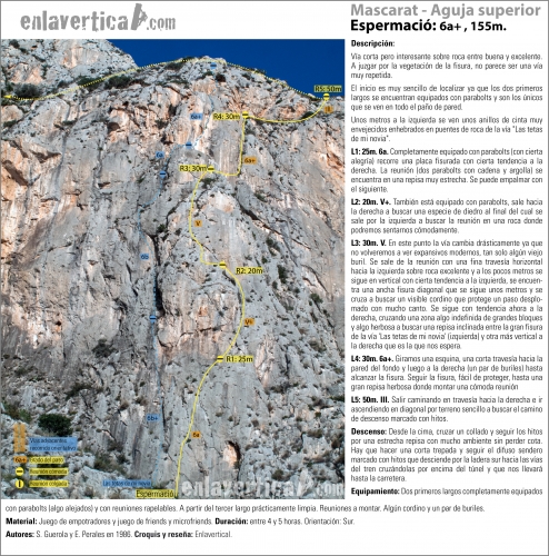 Vía corta pero interesante sobre roca entre buena y excelente. A juzgar por la vegetación de la fisura, no parece ser una vía muy repetida.