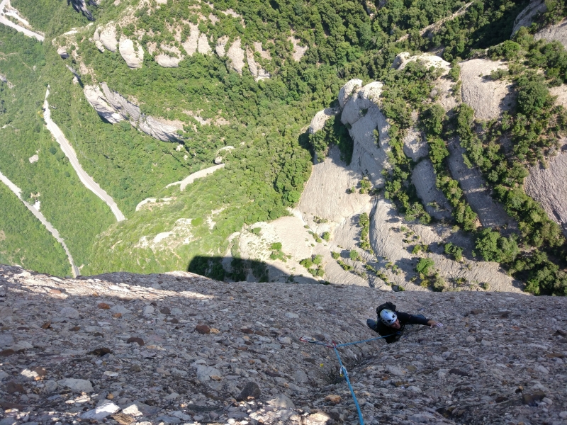 Se sale hacia la derecha a buscar una fisura de dudosa sonoridad pero muy disfrutona, luego habrá que navegar por placa fina con cierta tendencia a la izquierda, con una secuencia delicada de llegada a la reunión.