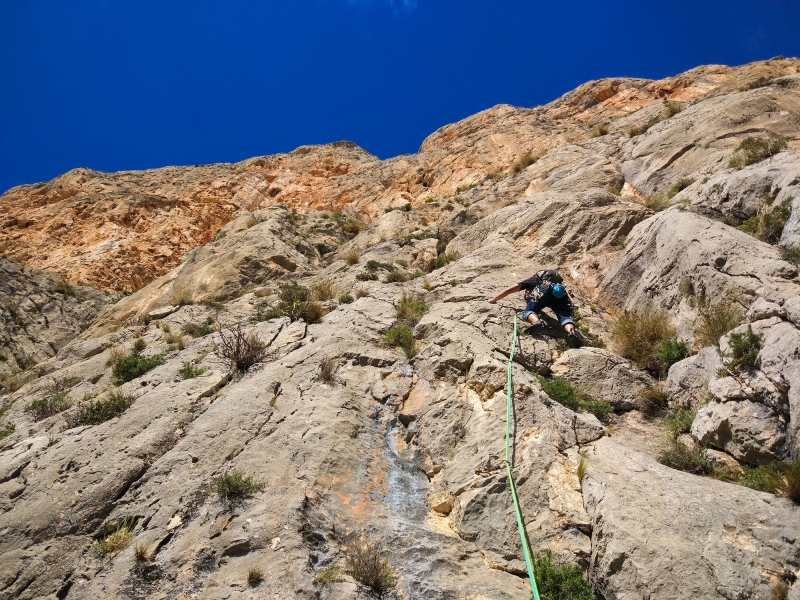 Comienza por placa fina de roca naranja, sigue por una sección mantenida con tendencia a la izquierda con un final algo más sencillo sobre roca gris.