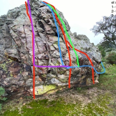 Travesía de derecha a izquierda de ?el solitario? con salida por arriba. Sobre él croquis línea azul+morada