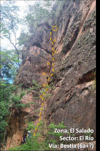 Cuando a Pepe le surge la idea de abrir una línea de escalada en ese diedro la verdad "no le daba ni un peso", luego de varias jornadas de limpieza y unas cuantas de trabajo duro de equipar a lo "bestia" finalmente quedó la ruta homónima.