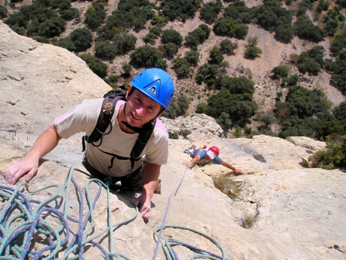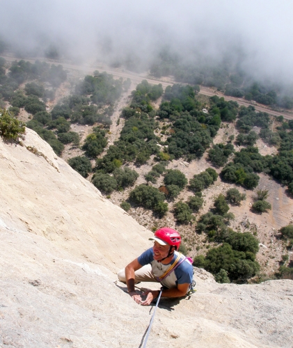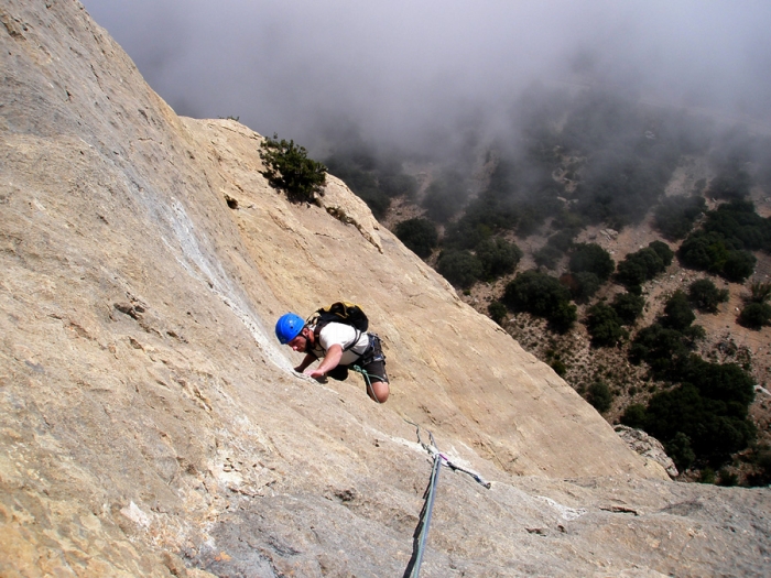 Salimos hacia la derecha por una placa preciosa, seguiremos un fisura que nos sitúa justo en un pequeño desplome (paso protegido por un spit y un clavo), una vez superado saldremos hacia la izquierda por una placa (existe un puente de roca) para luego ir a derechas.