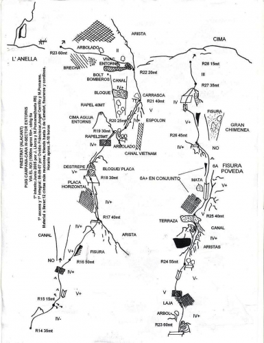En realidad se trata de una interesante combinación de rutas, con una entrada original de 4 largos. El comienzo se encuentra unos 50 metros a la izquierda del canalón que sube hacia la R0 de Els entorns. Una chapa en una corta placa con una pequeña canal a su derecha, nos indica el punto de inicio. No confundir con el inicio de la Borderline que queda unos metros a la izquierda en una fina placa bastante más larga (7a). Los primeros largos se encuentran bastante equipados con chapas y puentes de roca. Desde el collado del quinto largo, la vía atraviesa una pedrera para enlazar con la vía Chorro-Pomares, de la que un par de largos más arriba saca una variante por un mantenido e interesante diedro fisura para volver a enlazarla de nuevo un largo más arriba. Continúa por Els entorns hasta el rápel y sale por la Montesinos-Botella. Los últimos largos fueron equipados con parabolts introduciendo alguna ligera variante respecto al trazado original.