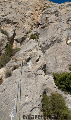 Este último largo discurre por una fisura con mucho canto. Antes de la sección clave (diedro + techo) del largo encontraremos una antigua reunión con dos clavos donde se puede hacer una reunión intermedia (protegiéndola debidamente) y ver al compañero mientras realiza el paso clave de la vía: un techo que sortearemos por la derecha siguiendo la fisura/diedro evidente hasta llegar a la última reunión y descuelgue, donde encontraremos variedad de cintas antiguas rodeando una arista.