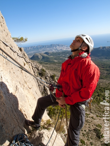 Mítica vía del Puig Campana de recorrido evidente, reuniones semiequipadas y largos muy disfrutones. Vale la pena.