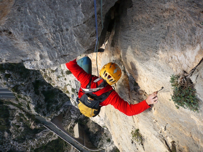 Salimos hacia la derecha por unas placas (buril) y vamos a buscar un pequeño techo amarillo (clavo). Tramo delicado. Seguir unos metros hacia la derecha en horizontal y luego en recto hacia arriba por lajas y gotas de agua hasta llegar a una cómoda repisa a la izquierda donde veremos la reunión.