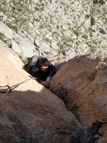 Sigue una serie de fisuras y diedros de dificultad moderada y de gran bellea con ligera tendencia a la izquierda.
