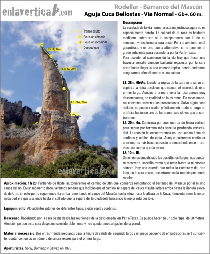 Comienza por unos metros de fisura vertical para seguir por terreno más sencillo perdiendo verticalidad. La reunión la encontraremos en una sabina llena de cordinos y anillos de cinta. Aunque podremos continuar unos metros más hasta cerca de la cima donde encontraremos una cuerda que la rodea.