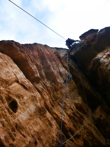 Nos dirigimos a la izquierda (mirando al patio) hasta encontrar en un pino una cuerda que nos deja en una línea de rapel. Éste nos dejará en el jardín de la Pericondrio. En dos rapeles largos al suelo (Con cuerdas de 50 m). Si vais en simple 4 rápeles de 35 m. También se puede bajar andando siguiendo hacia el Este hasta encontrar un