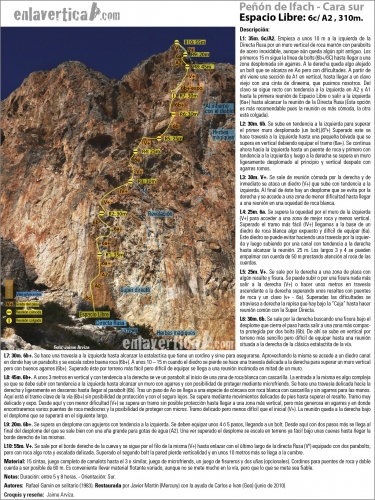 Empieza a unos 10 m a la izquierda de la Directa Rusa por un muro vertical de roca marrón con parabolts de acero inoxidable, aunque aún queda algún spit antiguo. Los primeros 15 m sigue la línea de bolts (6b+/6c) hasta llegar a una zona desplomada sin agarres. A la derecha queda algo alejado un bolt que se alcanza en A0 pero con dificultades. A partir de ahí viene una sección de A1 en vertical, hasta llegar a un clavo viejo con una cinta de dyneema, que pusimos nosotros. Del clavo se sigue recto con tendencia a la izquierda en A2 y A1 hasta la primera reunión de Espacio Libre o salir a la izquierda (6a+) hasta alcanzar la reunión de la Directa Rusa (Esta opción es más recomendable pues la reunión es más cómoda, la otra está colgada).