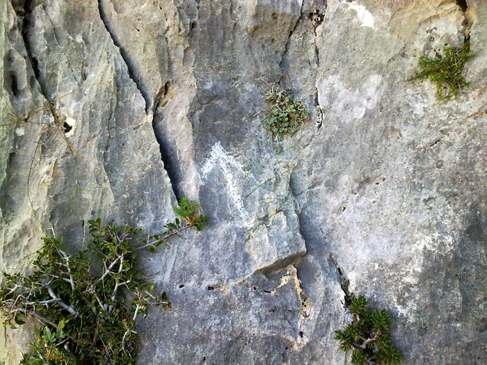 El comienzo de la vía está marcado con una flecha blanca picada en la roca.