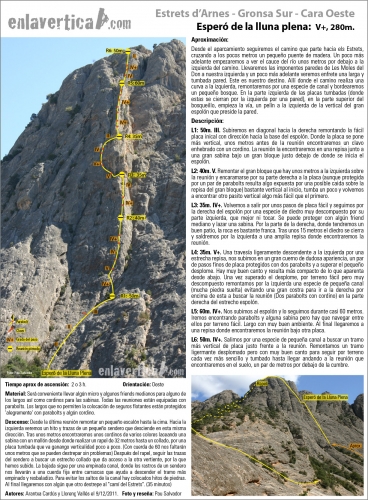 Una travesía ligeramente descendente a la izquierda por una estrecha repisa, nos subimos en un gran cuerno de dudosa apariencia, un par de pasos finos de placa protegidos con dos parabolts y a superar el pequeño desplome. Hay muy buen canto y resulta más compacto de lo que aparenta desde abajo. Una vez superado el desplome, por terreno fácil pero muy descompuesto remontamos por la izquierda una especie de pequeña canal (mucha piedra suelta) evitando una gran costra para ir a la derecha por encima de esta a buscar la reunión (Dos parabolts con cordino) en la parte derecha del estrecho espolón.