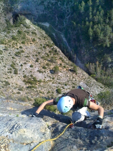 Salir de la reunión un poco a la derecha, dejando unos bloques a nuestra izquierda. Poco a poco el largo se va enderezando y ganando en dificultad; se pasa por medio de dos sabinas y por placa ganamos la R-3.