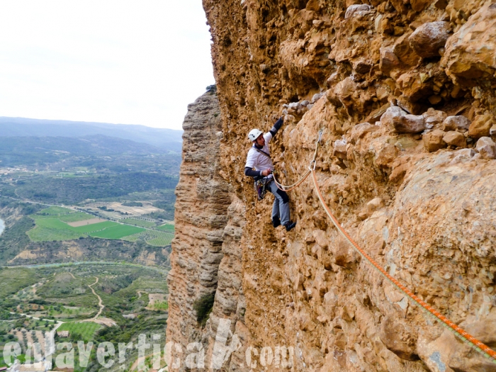 Desde la buitrera empieza lo realmente difícil. Un paso fino con canto pequeño para salir de esta y sigue con mejor canto, pero el desplome no da tregua.