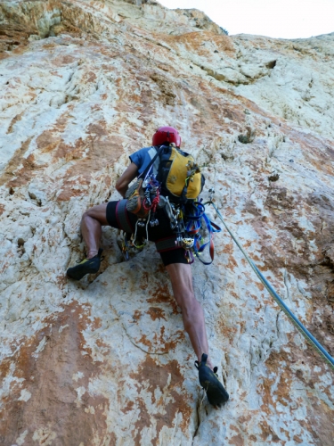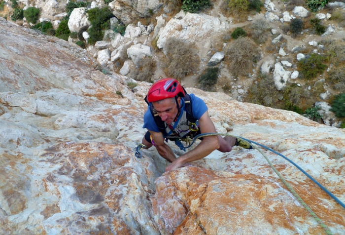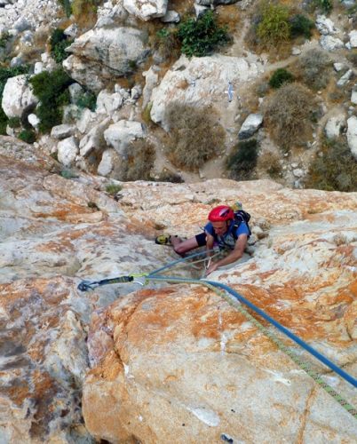 Seguimos una fisura de dedos que queda a la izquierda de la reunión para enlazar con un corto diedro cuyo final tiene un paso bloquero que da paso a una repisa inclinada donde se encuentra la reunión.