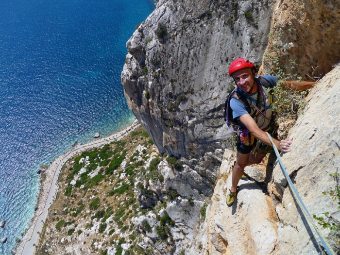 Salimos por la izquierda de la reunión por una especie de canalizo donde nos introducimos en una bóveda de la que saldremos por una serie de repisas romas hacia la izquierda con pasos desplomados pero sencillos, con abundante canto. La roca está marcada de negro por el efecto de la goma de los pies de gato. Encontraremos dos o tres parabolts en todo el largo que nos confirman el camino por el terreno más evidente.
