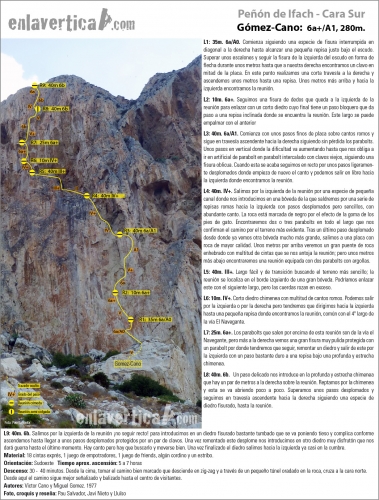 Comienza con unos pasos finos de placa sobre cantos romos y sigue en travesía ascendente hacia la derecha siguiendo sin pérdida los parabolts. Unos pasos en vertical donde la dificultad va aumentando hasta que nos obliga a ir en artificial de parabolt en parabolt intercalado con clavos viejos, siguiendo una fisura oblicua. Cuando esta se acaba seguimos en recto por unos pasos ligeramente desplomados donde empieza de nuevo el canto y podemos salir en libre hacia la izquierda donde encontramos la reunión.