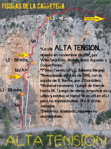 L1, 3 clavos y varios puentes de roca + R, en este largo se agradece un friend nº4#, aunque no es imprescindible, L2, 4 bolts + R, y L3, 1 puente roca y 1 clavo + R