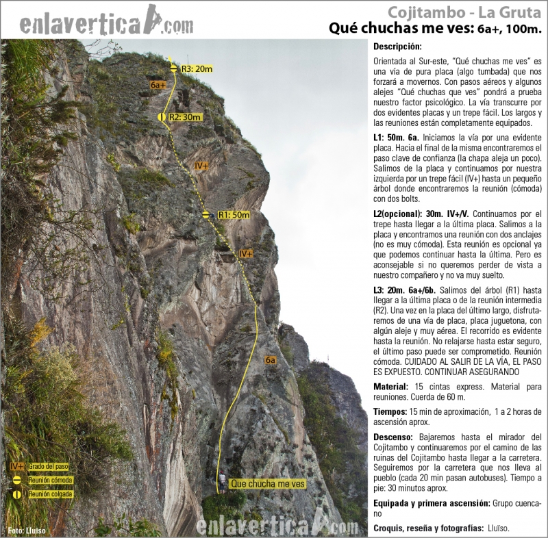 Grado: 5.9+; 5.10c. Orientada al Sur-este, ?Qué chuchas me ves? es una vía de pura placa (algo tumbada) que nos forzará a movernos. Con pasos aéreos y algunos alejes ?Qué chuchas que ves? pondrá a prueba nuestro factor psicológico. La vía transcurre por dos evidentes placas y un trepe fácil. Los largos y las reuniones están completamente equipados.